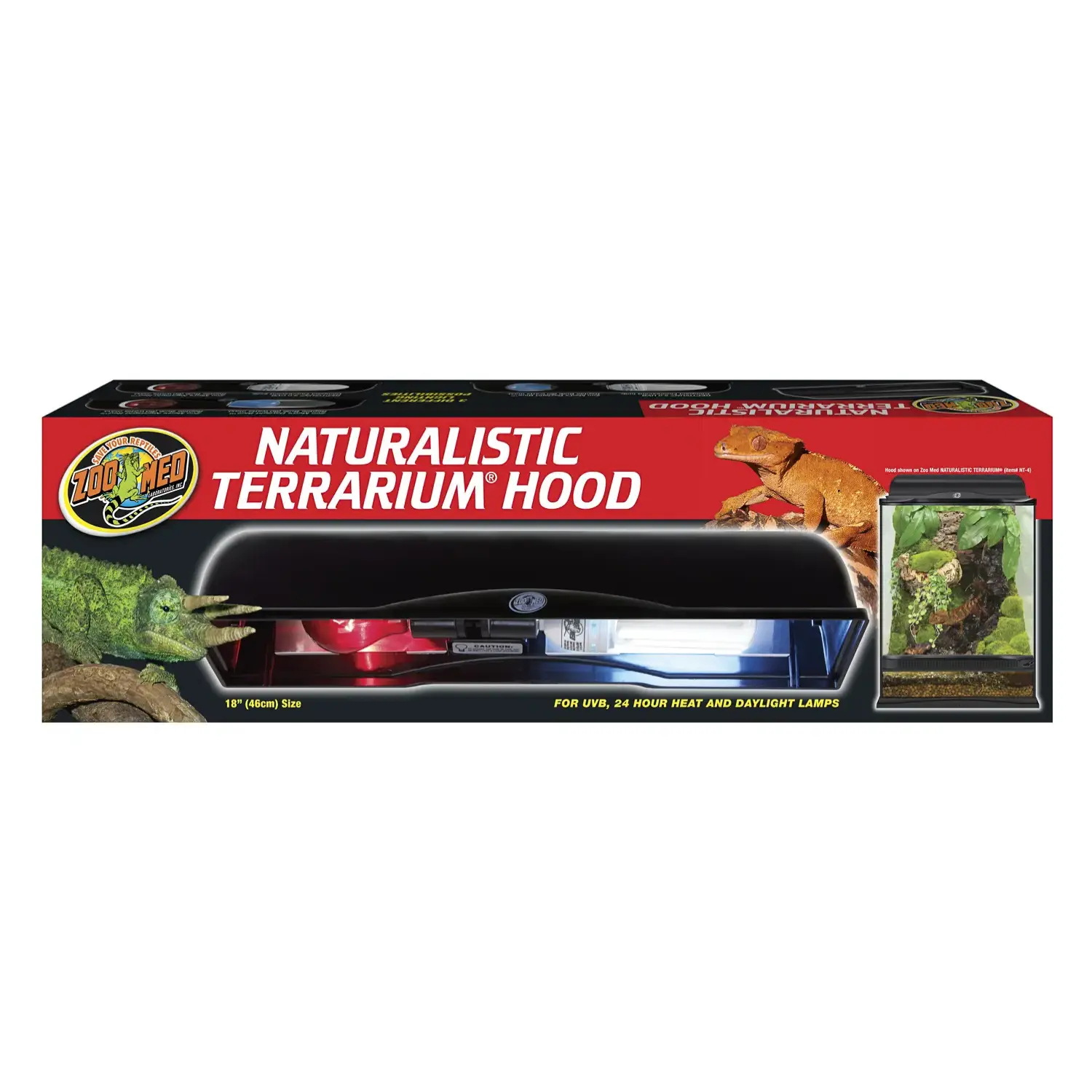 - The 18″ Naturalistic Terrarium® Hood includes a built-in reflector and two sockets for heat and UVB lamps. Fits all 18″ wide Naturalistic Terrariums® (Zoo Med items# NT-3 or NT-4).